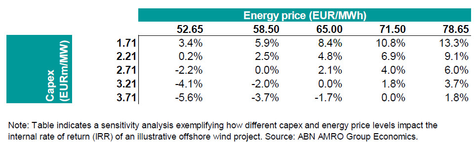 Zoals we eerder hebben uitgelegd, is er in een omgeving waar de initiële investeringskosten laag zijn en de energieprijzen relatief hoog zijn, minder behoefte aan stimuleringsmaatregelen van de overheid, zoals de maatregelen in de vorm van Contracts for Difference (CfD) die de winstgevendheid van het project garanderen. De publieke sector moet echter klaar staan om snel in te grijpen zodra zich externe schokken voordoen (zoals problemen met de bevoorradingsketen, stijgende inflatiedruk en dalende energieprijzen). Een voorbeeld hiervan is te zien in de onderstaande tabel, waarin te zien is dat zodra de kosten stijgen, de overheid hogere energieprijzen moet garanderen om een minimumniveau van winstgevendheid voor ontwikkelaars te garanderen (meer details over het model en onze aannames zijn hier te vinden).