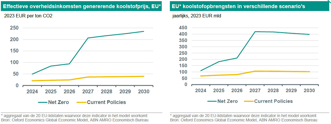 We hebben de koolstofinkomsten beoordeeld volgens het basisscenario van het Oxford-model (vergelijkbaar met het huidige beleid) en het Net Zero-scenario. In het scenario met het huidige beleid stijgt de effectieve koolstofprijs die overheidsinkomsten genereert tot ongeveer EUR 40 per ton CO2 in 2030, terwijl deze in het Net Zero-scenario stijgt tot EUR 235 per ton CO2. In het scenario met het huidige beleid zouden de extra koolstofinkomsten vanaf 2027 gelijk zijn aan ruwweg de helft van het groene investeringstekort van de overheid. In het Net Zero scenario zouden de extra inkomsten meer dan genoeg zijn om het gat te dichten. Merk echter op dat dit een ordelijk scenario is, waarin de gevolgen voor de economie van snel stijgende koolstofprijzen relatief gunstig zijn omdat de particuliere sector in een snel tempo koolstofarm maakt, geholpen door technologische vooruitgang. In een meer wanordelijk scenario zou de klap voor de economie leiden tot lagere belastinginkomsten, waardoor het positieve effect van hogere koolstofinkomsten op de begroting in mindere of meerdere mate teniet zou worden gedaan. Merk ook op dat, hoewel er een vereiste is dat alle veilinginkomsten worden gebruikt voor klimaat- en energie gerelateerde doeleinden, dit ook uitgaven voor aanpassing en het verzachten van de sociale gevolgen van stijgende prijzen omvat.