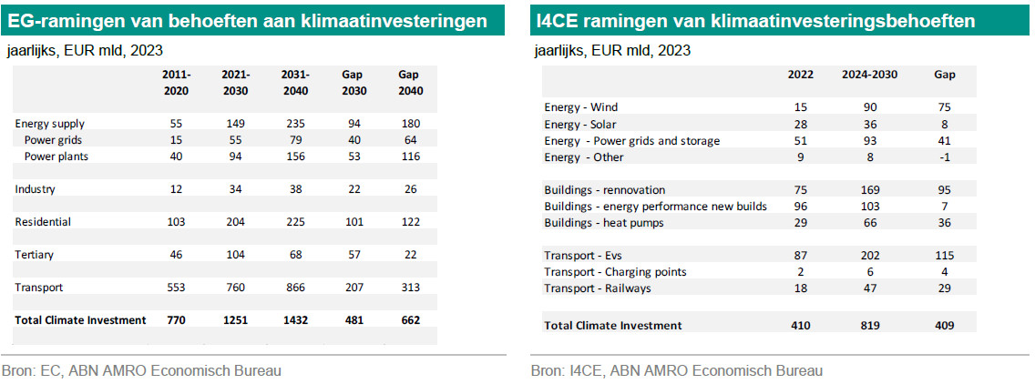 Schattingen van de investeringsbehoeften voor de energietransitie variëren vaak. Dit kan dan op basis van de dekking zijn – in termen van de sectoren en technologieën die worden beoordeeld – maar ook op aannames over toekomstige kosten en de tijdshorizon. Er bestaat echter brede overeenstemming over het feit dat er een investeringskloof bestaat en dat deze kloof aanzienlijk is. De Europese Commissie (EC) schat een jaarlijks investeringstekort van ongeveer EUR 480 miljard in de periode 2021-2030, vergeleken met de geregistreerde bedragen in 2011-2020 (zie ). Dit is het bedrag dat nodig is om de uitstoot met 55% te verminderen ten opzichte van 1990. De investeringsbehoeften zijn groter voor het decennium daarna, op basis van de onlangs door de EC voorgestelde reductiedoelstelling van 90% voor 2040 (zie ). Het verschil loopt op tot EUR 767 miljard per jaar voor 2031-2040. De uitsplitsing per sector staat in de tabel linksonder. Vervoer is de grootste categorie en omvat de aankoop van voertuigen, maar niet van infrastructuur zoals spoorwegen. Dit wordt gevolgd door investeringen in woningen (grotendeels als gevolg van de renovaties die nodig zijn om het gebouwenbestand koolstofvrij te maken) en investeringen in de energiesector.