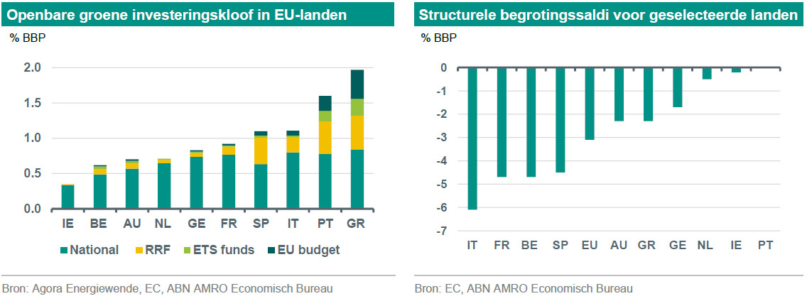 Ja en nee. De nieuwe begrotingsregels (zie ook onze notitie hier voor meer details) handhaven de oude begrotingsbenchmarks van een tekort van niet meer dan 3% en een schuld/BBP-ratio van 60%. Deze begrotingsdoelen zullen echter in een verschillend tempo voor elke lidstaat worden bereikt en het proces zal geleidelijk verlopen. Het doel voor de middellange termijn is een structureel tekort van 1,5% BBP. De meeste lidstaten zullen hun begrotingsbeleid moeten verkrappen (zie bijvoorbeeld de structurele tekorten in de grafiek rechtsboven). Regeringen krijgen een aanpassingsperiode van vier jaar, maar kunnen een verlenging van maximaal drie jaar krijgen als ze "zich verbinden tot hervormingen en investeringen die duurzaamheid en groei zullen ondersteunen". Dit betekent dat landen meer ruimte hebben om groene investeringen mogelijk te maken, maar deze uiteindelijk toch zullen moeten compenseren met fiscale aanpassingen elders. Gezien de slechte fiscale uitgangspositie en andere eisen die aan begrotingen worden gesteld - van defensie tot gezondheidszorg - zal het voor regeringen een enorme uitdaging blijven om de groene investeringskloof te dichten.