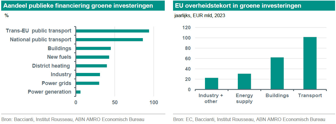 De rol van de publieke sector in het helpen dichten van deze kloof varieert aanzienlijk per sector. Zo is de rol van de publieke sector over het algemeen relatief laag bij energieopwekking, maar groter bij de transitie van woningen en zelfs zeer dominant in de sectoren openbaar vervoer en spoorwegen. Om de publieke groene investeringskloof te schatten, gebruiken we voornamelijk schattingen van publieke aandelen uit onderzoek van Claudio Baccianti (zie ), aangevuld met schattingen van Institut Rousseau (zie ). De aandelen die in deze analyse worden gebruikt, staan in de figuur linksonder, terwijl de publieke investeringskloof per sector wordt weergegeven in de figuur rechts. We gebruiken schattingen van de EC van de benodigde investeringen als basis, maar gebruiken andere bronnen waar de differentiatie en diepgang ontbreekt, vooral op die gebieden waar de publieke sector een bijzonder grote rol zou spelen. In totaal schatten we het tekort aan overheidsinvesteringen op ongeveer EUR 220 miljard per jaar of ongeveer 1,4% van het BBP. Een deel hiervan zou collectief op EU-niveau worden gefinancierd, maar het bedrag dat door de nationale regeringen moeten worden gefinancierd zal nog steeds aanzienlijk zijn, namelijk circa 1,1% van het BBP.
