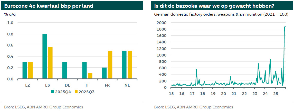 Alles bij elkaar blijft de eurozone opmerkelijk veerkrachtig, ondanks geopolitieke onzekerheid en Amerikaanse handelstarieven. Die zullen de komende maanden waarschijnlijk blijven drukken op de exportgroei, maar tegelijkertijd zal de binnenlandse vraag aantrekken door minder terughoudendheid van huishoudens en bedrijven én door stijgende Duitse overheidsuitgaven. Duitsland leverde inderdaad al een duidelijke positieve bijdrage aan de groei. Het Duitse bbp nam met 0,3% k-o-k toe, hoger dan de eerdere voorlopige Destatis-raming van 0,2%. Hoewel de industrie nog kwetsbaar is, namen de fabrieksorders in december opnieuw sterker toe, na een forse stijging in november. De ordergroei versnelde naar 13% jaar-op-jaar. Vooral binnenlandse orders stuwden deze groei, met een opvallend sterke toename in defensiesectoren zoals wapens en munitie (waar de orders in december met 569% stegen t.o.v. een jaar eerder).