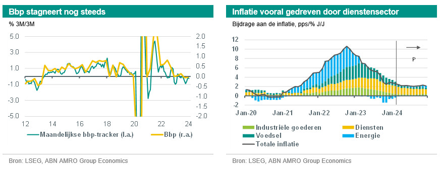 Het bbp is in de eerste maanden van 2024 waarschijnlijk weer ongeveer gelijk gebleven. Dankzij de aanhoudende economische zwakte neemt de onderliggende inflatiedruk af waardoor de ECB in juni kan beginnen met het verlagen van de rente.
