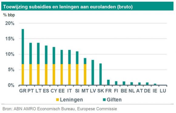 In onze ramingen komt duidelijk naar voren dat de perifere landen (zoals Griekenland, Portugal, Spanje en Italië) het meeste baat hebben bij het herstelfonds. Zo ontvangt Griekenland steun tot een bedrag van 18% van het bbp. Er zijn naar onze mening echter meerdere redenen voor voorzichtigheid ten aanzien van de groeiverwachtingen die het herstelfonds wekt. Uit onze analyse van de leningcomponent (zie kader hierboven) blijkt dat van het totale beschikbare bedrag 81% wordt opgenomen. Daarnaast vermoeden we, gezien recente ontwikkelingen, dat toewijzingen uit het herstelfonds voor een aanzienlijk deel zullen worden gebruikt om bestaande plannen te financieren. Duitsland en Frankrijk, die bij de vorming van het herstelfonds het voortouw namen, hebben al inzicht in de bestemming van te ontvangen gelden gegeven. Eind augustus maakte Duitsland bekend dat de toewijzing (in de vorm van subsidies in dit geval) zal worden gebruikt voor de financiering van maatregelen in het kader van het eerder door Duitsland aangekondigde herstelplan, dat de stijging van de overheidsschuld zou remmen. Op 3 september kondigde Frankrijk een stimuleringsprogramma van EUR 100 miljard aan. Hiervan wordt EUR 40 miljard gefinancierd met geld uit het herstelfonds (ook in dit geval subsidies). Van het programma van EUR 100 miljard gaat EUR 20 miljard naar verlaging van de vennootschapsbelasting. Van de EUR 25 miljard die is bestemd voor werkgelegenheid en opleiding, wordt een deel benut voor uitbreiding van de wtv-regeling en behoud van inkomen voor mensen die in deeltijd moeten werken. Tot slot denken we dat nationale hervormingsplannen slechts in geringe mate de toewijzing aan lidstaten zal beïnvloeden. De EC heeft verklaard toewijzingen pas uit te betalen wanneer lidstaten de in de hervormingsplannen geformuleerde mijlpalen en doelstellingen naar tevredenheid hebben gerealiseerd. Duitsland en Frankrijk hebben echter al laten blijken dat zij dit niet als een harde voorwaarde zien. In het algemeen is het onduidelijk in hoeverre de gelden efficiënt zullen worden besteed.