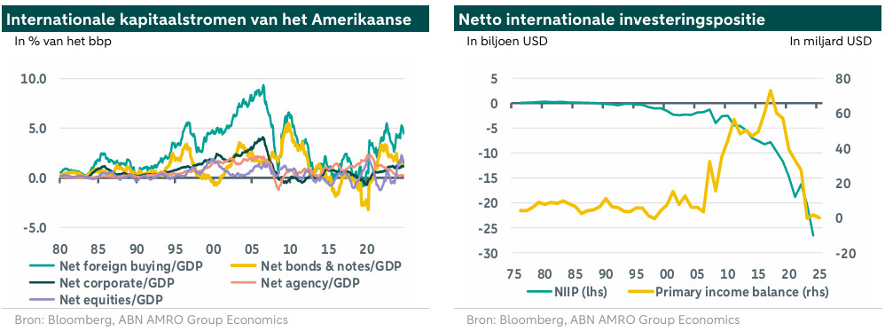 We beginnen met het begrotingstekort van de VS. Het begrotingstekort van de VS bevindt zich op een onhoudbaar traject (zie onze nota hier). In juli werd de One Big Beautifull Bill Act (OBBBA) aangenomen, die bijdraagt aan de stijgende schuld. De verlenging van de belastingverlagingen in dat wetsvoorstel is grotendeels ongedekt en vormt een risico dat het jaarlijkse begrotingstekort de komende jaren stijgt van de huidige 5-6% naar 7-8%. Op dit moment lijkt een deel van die kosten te worden gecompenseerd door tariefinkomsten. De tariefinkomsten zullen de komende jaren waarschijnlijk dalen, terwijl de overheidsuitgaven verder kunnen stijgen. Over het geheel genomen zal de begrotingssituatie verslechteren. De bezorgdheid over het onhoudbare begrotingstekort en de sluiting van de overheid hebben bijgedragen aan de zwakte van de dollar door de stijging van de risicopremies, wat betekent dat beleggers een hogere vergoeding wilden voor het risico dat ze nemen. De grafiek links hieronder laat zien dat de netto portefeuillestromen naar obligaties, notes en agency zijn gedaald, maar dat buitenlanders geen netto verkopers van Amerikaanse obligaties zijn geweest. Waarschijnlijk hebben zij hun valutarisicoafdekking verhoogd (zie hierboven).