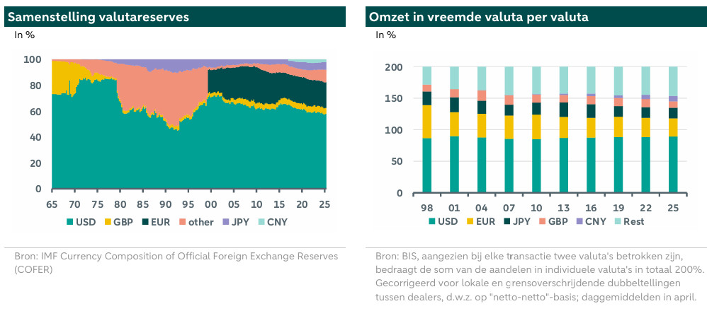 Een ander risico van een ernstigere uitverkoop van de dollar is de vrees dat de rol van de dollar in het financiële systeem zal afnemen en/of dat de dollar zijn status als veilige haven zal verliezen. Sommige beleggers hebben deze vrees al geuit in 2025. De hegemonie van de dollar is gebaseerd op verschillende dynamieken, waaronder het aandeel in het bbp, het aandeel in de facturering, het aandeel in grensoverschrijdende kredietverlening, het aandeel in internationale reserves, het aandeel in de valutahandel, het aandeel in betalingen, diepe financiële markten en militaire macht. Of de dollar deze dominante rol kan blijven spelen, hangt af van de vraag of er een serieuze concurrent voor deze subrollen zal zijn. Wij achten het onwaarschijnlijk dat de dollar de komende jaren zijn dominante rol in het financiële systeem en/of zijn status als veilige haven zal verliezen. Er is namelijk geen alternatief voor de dollar in termen van liquiditeit, noch in fiatvaluta's (euro, yen, Chinese yuan), noch in grondstoffen (goud) en noch in de digitale wereld (bitcoin, ether, stablecoins). In een volgende publicatie zullen we dieper op dit onderwerp ingaan.