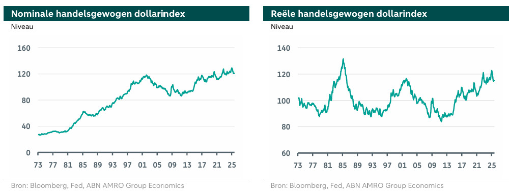 We verwachten dat de cyclische factoren een negatieve invloed blijven hebben op de dollar. We verwachten dat de Fed de rente meer zal verlagen. Dit is mogelijk al in de koers verdisconteerd, maar het risico van een nog gematigder beleid onder druk van president Trump is dat niet. Bovendien is dit beleid van de Fed niet ideaal voor de inflatievooruitzichten (zie hier voor meer). Als gevolg hiervan zullen de reële rentetarieven waarschijnlijk dalen, wat negatief is voor een valuta