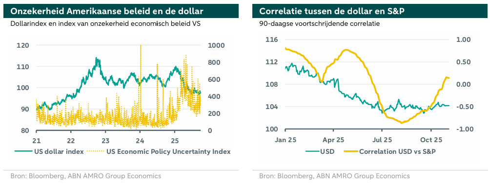 Het beleid van de Amerikaanse regering heeft invloed gehad op de groeivooruitzichten, de inflatiedynamiek en de verwachtingen ten aanzien van het monetaire beleid. De verwachtingen van een verdere versoepeling van het monetaire beleid door de Fed, een zwakkere groei dan verwacht en een ongunstige inflatiedynamiek hebben de Amerikaanse dollar onder druk gezet. Bovendien heeft de onzekerheid over het economisch beleid van de regering-Trump waarschijnlijk geleid tot een lagere dollar. De grafiek links hieronder toont de onzekerheid over het economisch beleid van de VS en de Amerikaanse dollar. De dollar heeft de neiging om te verzwakken als de onzekerheid over het economisch beleid van de VS toeneemt. Dit jaar is deze index historisch hoog geweest.