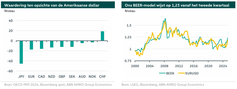 Een andere schatting van de waardering van de dollar ten opzichte van de euro komt van ons interne BEER-model (Behavioural Equilibrium Exchange Rate), dat kwartaalgegevens gebruikt om een 'fundamentele waarde' van de wisselkoers te schatten op basis van macro-economische fundamenten, waaronder handelsvoorwaarden, relatieve rendementen en relatieve prijsniveaus. De meest recente beschikbare gegevens wijzen op een 'fundamentele' waarde van de EURUSD van 1,23, de hoogste sinds 2017, en een aanzienlijke stijging sinds het dieptepunt in het derde kwartaal van 2024.