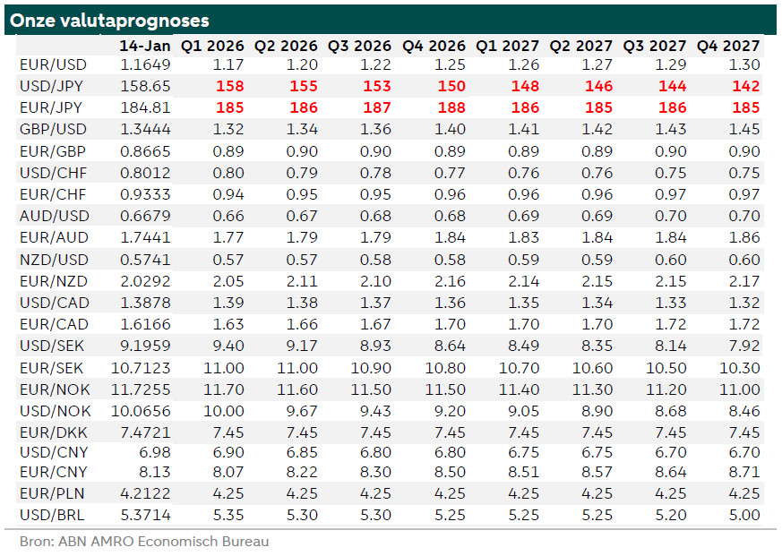 Op basis van al deze factoren hebben we onze yenprognoses bijgesteld. We verwachten dat het beleid van Sanae Takaichi – zowel budgettair als (geo)politiek – negatief zal doorwerken op de yen, vooral ten opzichte van de euro in 2026. We verwachten echter nog steeds een zwakke Amerikaanse dollar (zie onze wekelijkse update van vorige week), ook ten opzichte van de yen. Bovendien zouden de monetaire beleidstrends in de VS, de eurozone en Japan de yen moeten ondersteunen, vooral nu speculanten geen grote yenposities meer aanhouden.