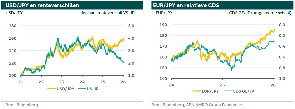 Politieke veranderingen in Japan Sanae Takaichi werd in oktober 2025 premier van Japan nadat ze de strijd om het leiderschap van de LDP had gewonnen. Ze kondigde omvangrijke plannen voor het opvoeren van overheidsuitgaven aan en nam een hardere houding aan ten opzichte van China, wat de spanningen deed toenemen. Beide factoren hebben de yen verzwakt. Sinds haar beleid bekend is gemaakt, is de onzekerheid toegenomen en zijn de credit default swap (CDS)-niveaus van Japan sneller gestegen dan die van de VS en Duitsland. De grafiek linksboven vergelijkt de EUR/JPY met de relatieve CDS-niveaus van Duitsland ten opzichte van Japan. Een lager cijfer betekent dat de CDS van Japan sneller stijgt (let op de as is omgekeerd). Takaichi heeft ook opgeroepen tot vervroegde verkiezingen, waarschijnlijk in februari, om een meerderheid voor haar partij veilig te stellen. Dit vergroot de politieke onzekerheid nog verder.