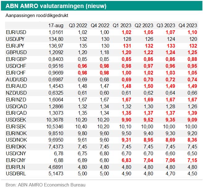Op 4 augustus hebben wij onze visie op de economie van de eurozone gewijzigd. Wij verwachten voor de komende kwartalen een recessie in de eurozone. Wat is de impact van deze gewijzigde visie op onze prognoses voor de EUR/USD? Onze gedachten zijn als volgt. Een recessie in de eurozone in combinatie met een agressiever beleid van renteverhogingen in de VS in vergelijking met de eurozone zal de euro dit jaar waarschijnlijk onder druk houden ten opzichte van de Amerikaanse dollar. Maar wij denken nog steeds dat een langdurige daling van EUR/USD onder pariteit moeilijk zal zijn. Daarom houden wij onze prognoses voor de EUR/USD voor de rest van dit jaar ongewijzigd.