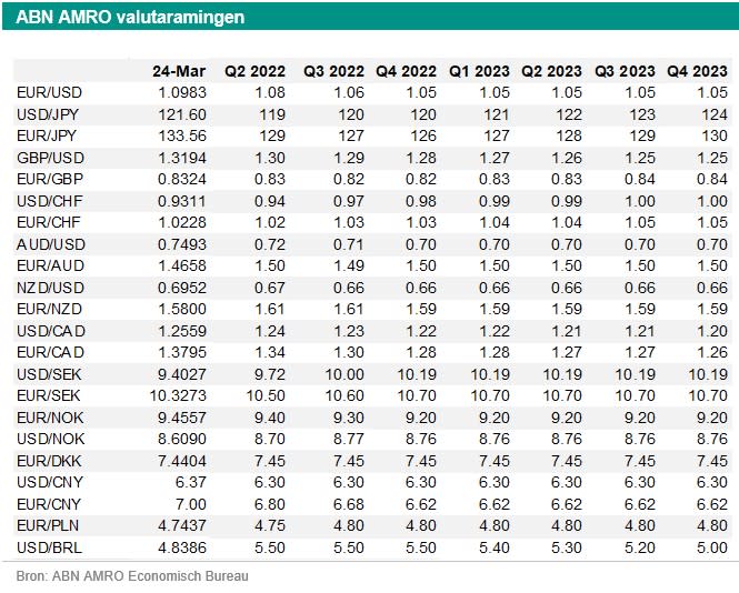 Onze EUR/USD prognoses zijn bijgesteld. Onze raming voor eind 2022 voor EUR/USD staat nu op 1,05. We hebben ook andere valutaprognoses bijgesteld.
