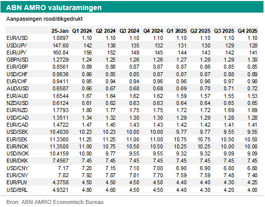 De Bank of Japan liet het beleid ongewijzigd op een moment dat de yen opnieuw onder druk stond. De markt probeerde USD/JPY weer naar het niveau van 150 te duwen, maar het hoogste punt dat werd bereikt was 148,80. Gouverneur Ueda gaf aan dat een einde van het ultra versoepelende monetaire beleid in het verschiet kan liggen. Als reactie daarop heeft de markt een dergelijke actie opnieuw ingeprijsd. Dat deed de markt eind december ook, maar dat bleek voorbarig. We stellen al lang dat de yen aanzienlijk ondergewaardeerd is ten opzichte van de euro en de dollar en dat de markt aanzienlijk yen verkocht heeft. De tienjaars renteverschillen tussen de VS en Japan en de eurozone en Japan hebben grote invloed op de koersen van USD/JPY en EUR/JPY. Deze renteverschillen geven al enige tijd aan dat de forse stijgingen in de koersen van EUR/JPY en USD/JPY niet gerechtvaardigd zijn. Het is waarschijnlijk dat het verkleinen van de renteverschillen tussen de VS en Japan en de eurozone en Japan (hoewel het grootste deel al is voorzien) leidt tot lagere niveaus in EUR/JPY en USD/JPY. Het is gewoon wachten op het begin van de versoepelingscycli in de VS en de eurozone. Een tegengestelde beweging van de Bank of Japan zou het herstel van de yen moeten helpen. Maar wij denken dat de markt te reikhalzend uitkijkt naar een beleidsverandering van de Bank of Japan. Het tempo en/of de timing ervan stellen vaak teleur (wij verwachten slechts een zeer geleidelijke stijging van de beleidsrente). Wij verwachten een herstel van de yen binnen onze prognosehorizon.