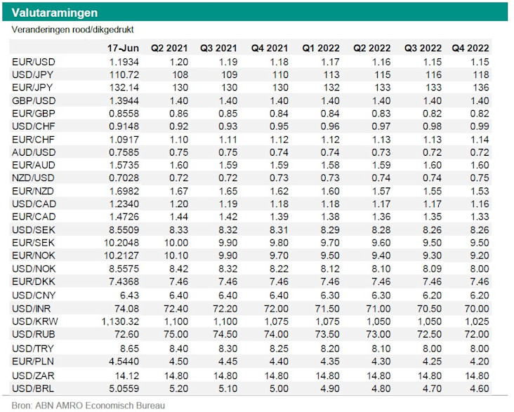 Vorige week hadden beleggers vooral de ECB in het vizier. Deze week ging hun aandacht vooral uit naar Amerikaanse macro-economische cijfers en het rentebesluit van de Fed. De Amerikaanse detailhandelsverkopen waren lager en de producentenprijsinflatie was hoger dan verwacht. Maar deze uitkomsten hadden geen negatief effect op de dollar. Het onderliggende beleggerssentiment was al iets aan het verbeteren. Hierbij spelen verschillende factoren een rol. Ten eerste blijft de dollarindex vaak maar tijdelijk onder het niveau van 90. Dit was het geval in januari en in maart en nu ook weer. Het lijkt erop dat beleggers dollars kopen als de dollarindex daalt onder het niveau van 90. Dit niveau komt overeen met een koers van EUR/USD boven de 1,22. Ten tweede gaf de Fed aan tweemaal de rente met 25 basispunten te verhogen voor het einde van 2023. De koers van de Fed lijkt nu duidelijk en dit heeft de dollar gesteund. Ten derde is de tienjaarsrente gecorrigeerd voor inflatie iets opgelopen. Vooral na het Fed-overleg was dit het geval. Dit is ook een steun in de rug voor de dollar. Het verschil van de tienjaarsrente gecorrigeerd voor inflatie tussen de VS en Duitsland/Japan is gestegen. Hierdoor is de dollar in waarde toegenomen ten opzichte van de euro en de yen. Tot slot blijft de ECB verruimingsgezind en dat werkt negatief door op de euro. Als gevolg van deze ontwikkelingen is EUR/USD gedaald tot onder het niveau van 1,20, USD/JPY is boven het niveau van 110 gestegen en de dollarindex staat weer boven het niveau van 91. We denken dat de dollar doorgaat met een gematigde opmars dit jaar en volgend jaar. Onze eindejaarsraming voor EUR/USD staat op 1,18. Mocht de Fed sneller gaan dan dat het nu aangeeft, dan is de opmars van de dollar waarschijnlijk groter.