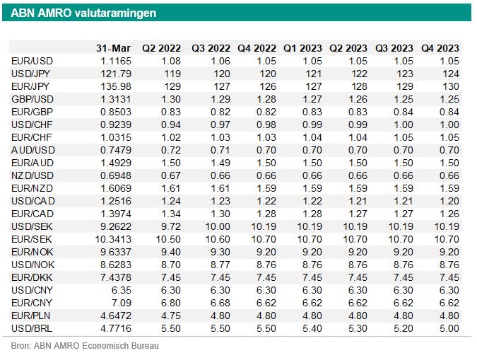Sinds eind vorige week zijn de verwachtingen voor renteverhogingen door de ECB harder gestegen dan die voor de Fed. Als gevolg daarvan is EUR/USD gestegen. Bovendien is het verschil tussen de tienjaars rente op Amerikaans staatspapier en Duits staatspapier aanzienlijk verkleind. Dit betekent dat de rente op Duits staatspapier harder is gestegen dan de rente op Amerikaans staatspapier. Ook dit heeft gezorgd voor een hogere EUR/USD. Tot slot lijken de markten meer ontspannen te zijn over de ontwikkelingen in Oekraïne. Ook dit heeft de EUR/USD geholpen. Wij verwachten dat de rally in EUR/USD op een gegeven moment zal stoppen. Wij verwachten dat het verschil van de tienjaars rente tussen de VS en Duitsland opnieuw zal toenemen (vanaf het huidige niveau) en dat het verschil in verwachte beleidsrente tussen de Fed en de ECB zal toenemen. Bovendien denken wij dat van tijd tot tijd beleggers meer voorzichtig zullen zijn. Ze kopen dan de Amerikaanse dollar als veiligehavenmunt. Daarom handhaven wij onze prognose voor EUR/USD van eind 2022 op 1,05.
