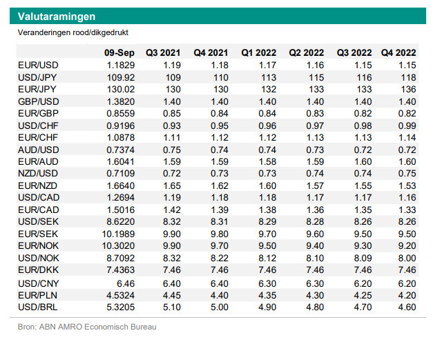 Vandaag is de ECB-beslissing. De ECB zal aangeven wat ze met de aankopen onder het pandemie-noodaankoopprogramma (PEPP) voor het komende kwartaal gaat doen. Daarnaast publiceert de ECB haar nieuwe ramingen voor de vooruitzichten van de economie. Wij denken dat de ECB pas in December laat weten of het pandemie-noodaankoopprogramma in maart 2022 zal stoppen en hoe het programma voor de aankoop van activa (APP) eruit gaat zien. We rekenen erop dat de ECB verruimingsgezind blijft klinken. We zien dan ook geen reden voor een verdere stijging van de euro ten opzichte van de Amerikaanse dollar, tenzij de Amerikaanse dollar meer onder druk komt.