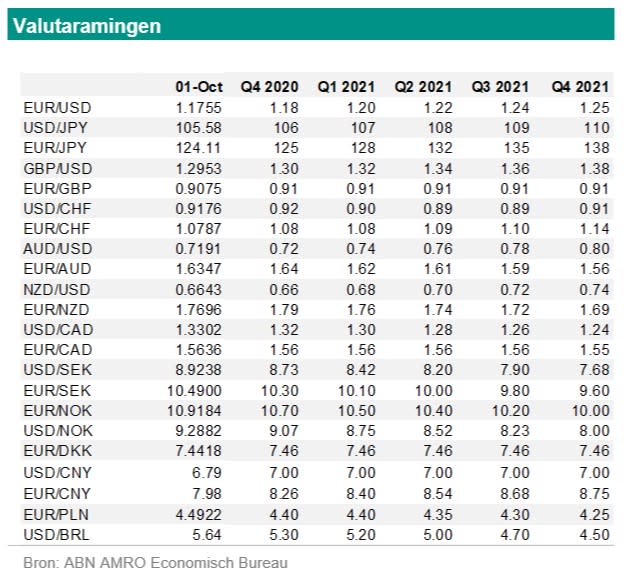 Aan het herstel van de Amerikaanse dollar kwam deze week een einde. De dollar steeg tot de EUR/USD net boven 1,16 was en kwam daar tot stilstand. Vervolgens daalde de dollar en steeg de EUR/USD. Dit kwam doordat het beleggerssentiment op de valutamarkten weer verbeterde. U weet inmiddels dat optimistische beleggers minder behoefte aan dollars hebben. Het televisiedebat tussen presidentskandidaten Biden en Trump was chaotisch. Dit heeft tot nu toe nog geen effect gehad op de peilingen. Reken maar dat beleggers het goed in de gaten houden. Amerikaanse macro-economische cijfers waren over het algemeen beter dan verwacht, maar later vandaag en morgen worden er meer belangrijke cijfers gepubliceerd. Ook hier blijven beleggers aandacht voor houden. Op dit moment moet de dollar het vooral hebben van de veiligehavenvraag als beleggers weer risico mijden. Daarnaast doet de dollar ook goede zaken als beleggers somberder worden over de vooruitzichten van het VK en de eurozone. Wij zijn minder optimistisch over de economie van het VK en de eurozone.