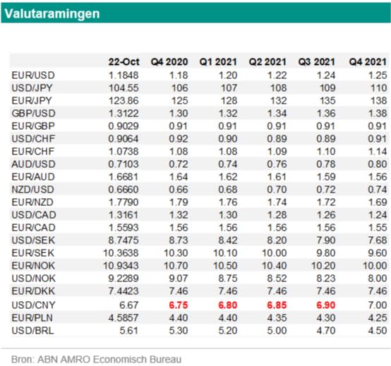 Op korte termijn kan de yuan nog iets stijgen maar niet veel. Beleggers testen momenteel tot hoever de Chinese autoriteiten een yuanstijging tolereren. De autoriteiten hebben al maatregelen genomen om de opmars van de yuan af te stoppen. Mocht de yuan toch te ver stijgen, dan komt er waarschijnlijk een verdere aanscherping van de maatregelen. Daarnaast zijn we iets voorzichtiger dan de markt over de vooruitzichten van de handelsbetrekkingen tussen de VS en China als Biden wint. We denken ook dat beleggers winst nemen op de door hen gekochte yuans als Biden inderdaad wint. We hebben onze ramingen voor de yuan wat verhoogd en de dollar verlaagd. Dit is een weerspiegeling van de factoren die we net genoemd hebben. Onze nieuwe eindejaarsraming voor USD/CNY is nu 6,75 (was 7,0). We laten onze raming voor USD/CNY eind 2021 staan op 7,0.