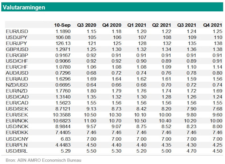 De koers van de dollarindex beweegt zich al een tijd in een krappe bandbreedte van 92 tot 94. Dit is ook te zien in de koers van EUR/USD. De koers van EUR/USD beweegt zich tussen 1,17 en 1,20. De uitkomst van de vergadering van de Fed heeft daar geen verandering in gebracht. Voor de vergadering daalde de dollar iets. Na de publicatie van de begeleidende verklaring en tijdens het vragenuurtje met voorzitter Powell herstelde de dollar zich weer. De nieuwe ramingen van de Fed geven aan dat de rente tot en met 2023 laag blijft. De Fed heeft twee mandaten: prijsstabiliteit en maximale werkgelegenheid. De Fed is heel verruimingsgezind maar dit zit voor een groot deel al in de koers van de dollar verdisconteerd. We verwachten nog steeds een herstel van de dollar op korte termijn. We denken dat beleggers weer wat dollars gaan kopen. Dit kan het gevolg zijn van veiligehavenvraag of dat Amerikaanse macro-economische cijfers beter zijn dan verwacht. We denken nog steeds dat de koers van EUR/USD kan dalen richting 1,15 in de komende weken.