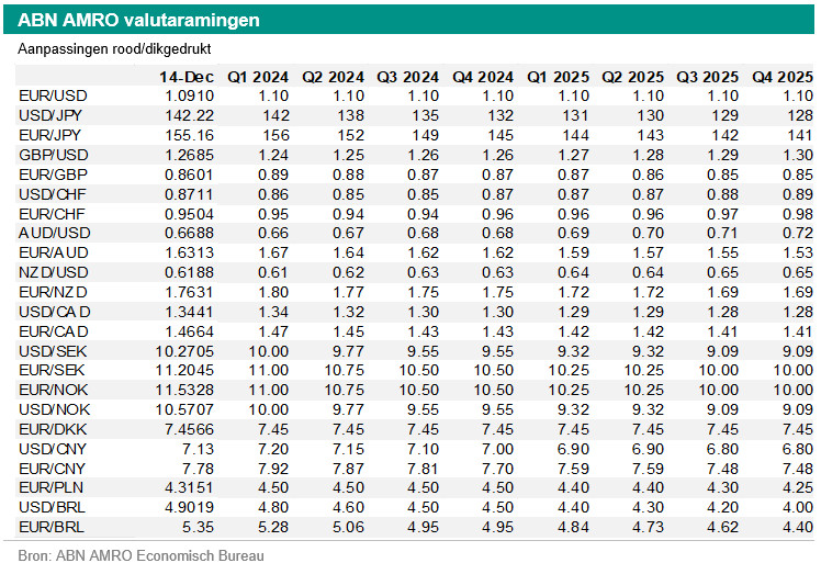 Sinds oktober bevindt EUR/USD zich in de trading range van 1,05-1,10. De markt was eind november niet in staat om EUR/USD boven 1,10 te duwen en daar te houden, dus besloot de markt om te kijken of het succesvoller is om de onderkant van de range te breken. De koers daalde tot 1,0724 voordat het wat steun vond. In de afgelopen weken hebben de rentemarkten onze visie voor de Fed en de ECB voor 2024 ingeprijsd. Als deze monetaire versoepeling volgend jaar wordt doorgevoerd (in totaal 125 basispunten aan renteverlagingen door de Fed en de ECB), dan zal EUR/USD binnen deze 1,05-1,10 blijven, totdat een andere drijfveer zich aandient. Zowel de Fed als de ECB deden deze week wat van hen werd verwacht. Sommige commentaren van de Fed werden als meer verruimingsgezind beschouwd, terwijl sommige commentaren van de ECB als enigszins verkrappingsgezind werden beschouwd. Dit had enig opwaarts effect op EUR/USD, maar EUR/USD bleef binnen de bandbreedte.