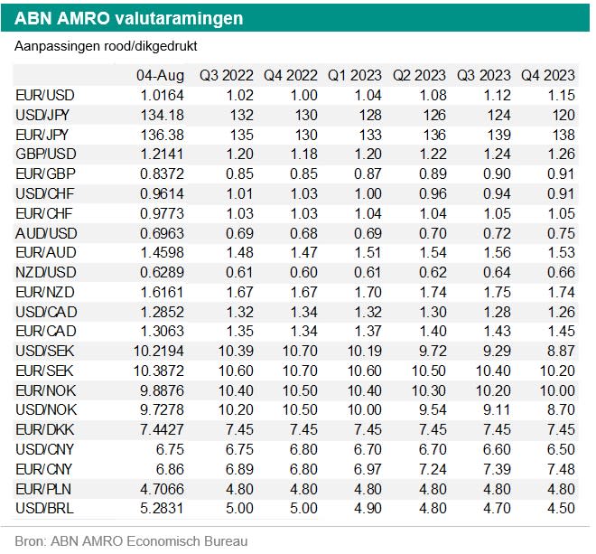 Op 14 juli dook de koers van EUR/USD onder pariteit en zette een dieptepunt op 0.9952. Maar de beweging zette niet door. EUR/USD steeg snel weer boven pariteit, en handelt sindsdien in een range van 1.00-1.03. Hiervoor zijn verschillende redenen aan te voeren. Ten eerste steunde de verwachting van een renteverhoging met 50 basispunten tijdens de ECB-vergadering van 21 juli de euro. Ten tweede zijn de nominale en reële rentetarieven verder gedaald. De beweging was groter in de Duitse rente vergeleken met de Amerikaanse rente. Dit werkte negatief door op de koers van EUR/USD. Ten derde heeft de vakantieperiode geleid tot minder activiteit op de financiële markten. Deze richtingloze markt zou kunnen aanhouden tot half september. Maar zolang EUR/USD onder de 1.0350 staat, blijft het korte termijn-beleggerssentiment negatief.