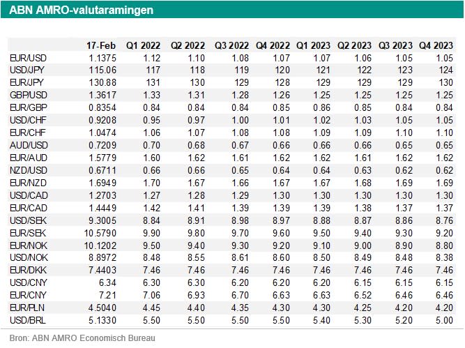 Deze week waren Amerikaanse macro-economische cijfers opnieuw hoger dan verwacht. Op dinsdag werd de producentenprijsinflatieindex van januari gepubliceerd. Deze is harder gestegen dan waar beleggers rekening mee hielden. Op woensdag kwamen de cijfers voor de detailhandelsverkopen uit. Ook deze waren hoger dan verwacht. Maar de Amerikaanse dollar steeg niet, omdat de verwachtingen over renteverhogingen door de Fed niet veranderden. De notulen van de laatste Fed-vergadering lieten zien dat in verband met de hogere inflatie de rente in maart wordt verhoogd en dat het tempo van renteverhogingen hoger kan zijn. Beleggers houden rekening met enkele renteverhogingen door de Fed dit jaar. De markt verwacht dat aan het einde van 2022 de beleidsrente 150 basispunten hoger staat dan nu het geval is. De Fed zal waarschijnlijk moeite hebben om aan deze verwachtingen te voldoen, wat het opwaarts potentieel voor de dollar kan afremmen. Maar op de valutamarkten gaat het om de relatieve verwachtingen en vooruitzichten. Met andere woorden, de rentevooruitzichten ten opzichte van die van andere munten zijn van belang. In onze FX Weekly van vorige week gaven we aan dat beleggers ook veel renteverhogingen in andere landen verwachten. Ze denken dat in het VK de beleidsrente aan het einde van 2022 150 basispunten hoger staat dan nu het geval is, voor Australia is dat 125 basispunten, voor de eurozone 45 basispunten, voor Canada 170 en voor Nieuw-Zeeland 180 basispunten. Kortom de verwachtingen zijn hooggespannen. Wij denken dat beleggers teleurgesteld gaan worden en dat de Amerikaanse dollar ruimte heeft om te stijgen ten opzichte van deze valuta’s. Volgende week zal alle aandacht uitgaan naar de consumentenprijsinflatie in de eurozone, de presentaties van Fed- en BoE-beleidsfunctionarissen, Amerikaanse macro-economische data en het rentebesluit door de centrale bank van Nieuw-Zeeland. Volgende week is er geen FX weekly, maar de week erna nemen we de belangrijkste ontwikkelingen mee.