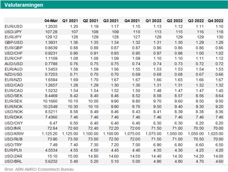 GBP/USD liet een aanzienlijke stijging zien in de afgelopen week. Het psychologische niveau van 1,40 is doorbroken en de koers steegs zelfs naar 1,4237. Daarna won de dollar weer iets terug op het pond. Hogere Amerikaanse langetermijnrentes speelden hierbij een rol. Maar ook de verwachting dat het afbouwen van lockdown-maatregelen in het VK langer zal duren dan men eerder had aangenomen. We denken dat het pond verder kan dalen. De vaccinatievoorsprong van het VK gaat afnemen, de Bank of England kan haar monetair beleid nog verder verruimen en de economie staat er niet goed voor na brexit en de pandemie.
