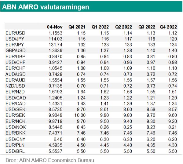 Het monetair beleid wordt minder verruimend. De Fed begint met taperen en de dollar blijft veerkrachtig. De centrale bank in Australië blijft wel verruimingsgezind klinken en hierdoor daalt de munt. De Poolse centrale bank verhoogt agressief de rente en de munt stijgt. De Norges Bank verhoogt mogelijk in december de rente.
