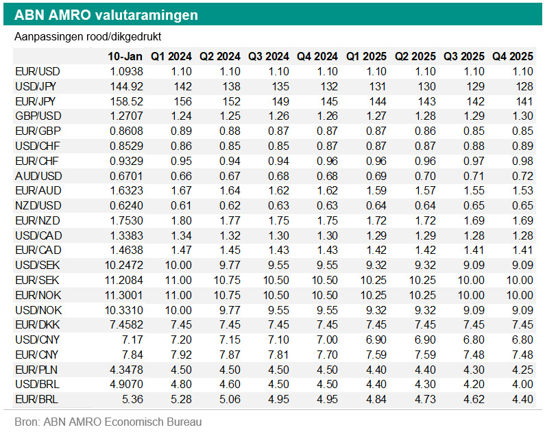 Voor dit jaar verwachten we dat de verwachtingen voor het Fed/ECB-beleid de richting van EUR/USD zullen blijven bepalen. De markt verwacht dat zowel de Fed als de ECB in april/mei beginnen met hun versoepelingscyclus en dat de rente tegen het einde van 2024 wordt verlaagd naar 4% voor de Fed en 2,5% voor de ECB. Wij hebben een iets andere mening. Wij verwachten dat de versoepelingscycli later beginnen, in juni, en dat de Fed aan het eind van het jaar uitkomt op 4,25% en de ECB op 2,75%. Dus zowel voor de Fed als voor de ECB zijn we iets minder verruimingsgezind dan de markt en het verschil met de markt is ongeveer hetzelfde.