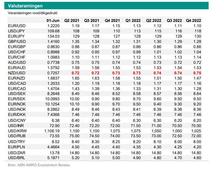 Vorige week liet ook de centrale bank van Nieuw Zeeland haar beleid ongewijzigd. De beleidsrente staat op 0,25%. In een begeleidende verklaring werd aangegeven dat de beleidsrente niet wordt verhoogd totdat er vertrouwen is dat de inflatie duurzaam dichtbij 2% zit en dat de werkgelegenheid op het maximaal duurzaam niveau is. Naast de verklaring publiceerde de centrale bank ook prognoses voor de beleidsrente. Deze prognoses lieten zien dat de beleidsrente mogelijk in de tweede helft van 2022 wordt verhoogd. Verder lijkt rekening te worden gehouden met een totaal van 125 basispunten aan renteverhogingen tot het einde van 2023. Dus het is waarschijnlijk dat de centrale bank van Nieuw Zeeland eerder dan de Fed en ruim voor de ECB de rente gaat verhogen. We hebben onze ramingen voor de Nieuw-Zeelandse dollar naar boven bijgesteld.