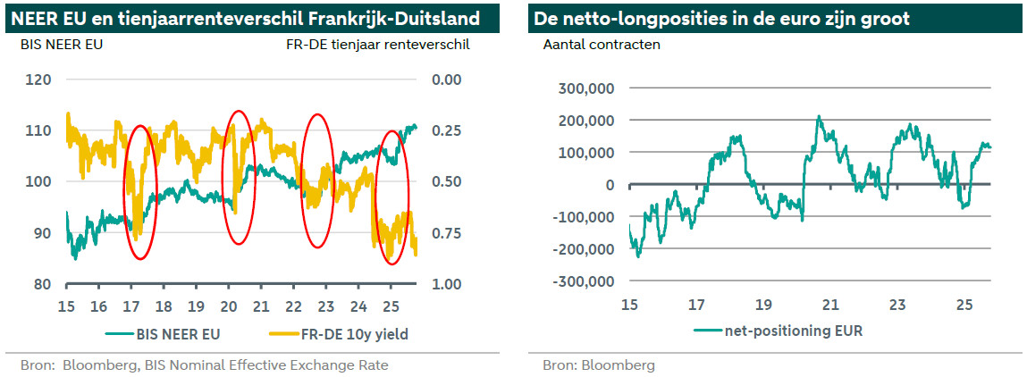 Ten tweede spelen de factoren die ervoor zorgen dat de Amerikaanse dollar niet verder zakt nog steeds een rol. Om te beginnen blijven beleggers positief over de ontwikkelingen dat de VS voorop loopt in de wereldwijde opkomst van kunstmatige intelligentie (AI) en digitale assets. Bovendien hebben politieke en fiscale zorgen in Frankrijk de euro onder druk gezet. Wanneer bijvoorbeeld het verschil tussen de rendementen op Franse en Duitse staatsobligaties groter wordt, daalt vaak de euro (zie bovenstaande grafiek links, grote verschil is lager in de grafiek). Hoewel deze trend dit jaar minder duidelijk is geweest vanwege andere factoren, heeft de onzekerheid in Frankrijk waarschijnlijk negatief doorgewerkt op de euro. Bovendien heeft de speculatieve gemeenschap een bescheiden shortpositie in de Amerikaanse dollar en grote netto longposities in de euro en de yen (zie grafiek rechtsboven). Zij aarzelen echter om deze posities verder uit te breiden, deels vanwege hoe de prijsgrafiek eruit ziet.