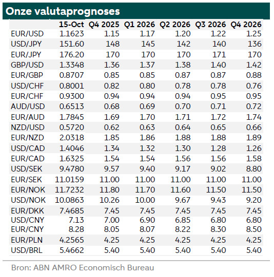 Vorige week gaven we aan dat de daling van de Amerikaanse dollar was gestopt. De opmerkingen van Fed-voorzitter Powell eerder deze week hebben echter gezorgd op een lichte neerwaartse druk op de dollar. Als gevolg daarvan staat de EUR/USD weer boven 1,16. Naar aanleiding van de opmerkingen van Fed-voorzitter Powell hebben we onze visie op de Fed bijgesteld (zie hier voor meer informatie). We verwachten nu dat de Fed zowel tijdens de vergadering in oktober als in december de rente zal verlagen, en volgend jaar nog eens met 75 basispunten, met een kwartaaltempo van 25 basispunten, waardoor de uiteindelijke bovengrens van de Fed-fundsrente in september 2026 op 3,00% uitkomt. Hierdoor wordt de versoepeling naar voren gehaald en wordt de terminal rente iets eerder bereikt.