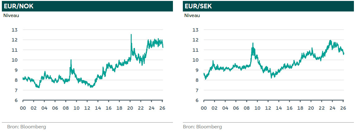 Vorig jaar presteerde de Zweedse kroon beter dan de andere belangrijke valuta’s, met een stijging van 20% ten opzichte van de Amerikaanse dollar en van 6% ten opzichte van de euro. De Noorse kroon deed het ook beter dan de dollar, maar verloor iets ten opzichte van de euro. Dit jaar zijn beide valuta sterk gebleven: de Noorse kroon steeg met 5% ten opzichte van de euro en de Zweedse kroon met 1,2%. In deze FX Weekly is er aandacht voor de recente trends van de Zweedse kroon en Noorse kroon.