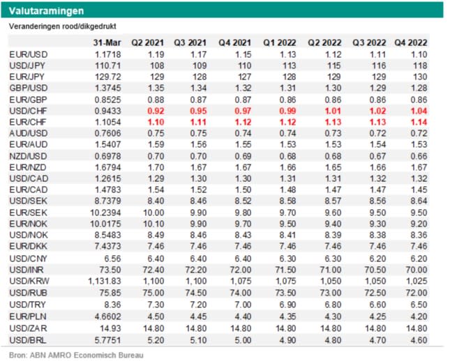 Verwachten we dat de frank verder gaat dalen? We hadden rekening gehouden met een daling van de frank. Maar het is eerder en sneller gekomen dan we hadden voorzien. We denken dat de tienjaars rentes op staatspapier te hard zijn gestegen en we verwachten een daling richting het eind van 2021 in de eurozone en in de VS. Hierdoor zou de frank wat terrein kunnen terugwinnen. Wel denken dat een dergelijke stijging van de frank beperkt en tijdelijk van aard zal zijn. De Zwitserse centrale bank vindt nog steeds dat de frank (te) duur is. Dus mocht de frank in waarde toenemen, dan zal de centrale bank dit proberen te beperken. Daar komt bij dat we denken dat beleggers dit jaar en volgend jaar relatief optimistisch blijven. Ze zullen dan geen behoefte hebben om de veiligehavenmunten zoals de frank en de yen te kopen. We hebben onze ramingen aangepast als gevolg van deze ontwikkelingen.