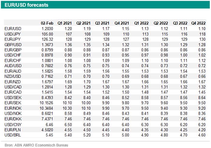 Maar er is weinig opwaarts potentieel op de korte termijn. We denken dat de Amerikaanse groei al vanaf dit jaar een inhaalslag maakt. Daar komt bij dat ook President Biden een aantal zaken met betrekking tot China aan de orde gaat stellen. Tot slot is de yuan al aanzienlijk gestegen en wordt algemeen aangenomen dan de yuan duur is. Op een gegeven moment gaan de Chinese autoriteiten de stijging van de yuan temperen. Onze raming voor USD/CNY voor eind 2021 is 6,40 en voor eind 2022 6,20.