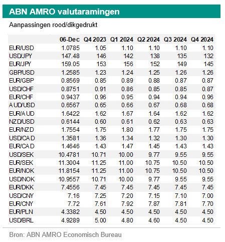 De Bank of Canada heeft de rente ongewijzigd gelaten op 5%. Hogere rentetarieven zijn voelbaar in de economie. Het reële BBP kromp in het derde kwartaal van 2023 met 1,1%. De arbeidsmarkt wordt minder krap, maar de lonen stijgen nog steeds met 4-5%. De vertraging van de economie vermindert de inflatiedruk. Ze blijft bereid om de rente verder te verhogen als dat nodig is. Het inflatie doelbereik is 1-3%. De inflatie ligt dicht bij de doelstelling. De centrale bank is bijna aan het einde van de verkrappingscyclus gekomen. Er kan nog steeds behoefte zijn aan wat fine-tuning, dus een nieuwe renteverhoging in de toekomst is nog steeds mogelijk. De markt gaat ervan uit dat de centrale bank klaar is met het verhogen van de rente en verwacht volgend jaar renteverlagingen. Wij denken dat het aantal renteverlagingen door de Bank of Canada kleiner is dan wat we verwachten voor de Fed en de ECB. Daarom hebben we volgend jaar een lichte stijging in de Canadese dollar.
