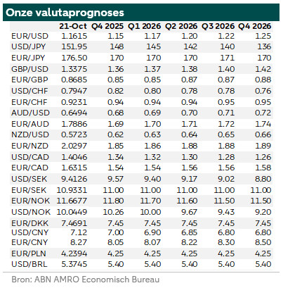 Ondanks de hernieuwde spanningen tussen de VS en China blijven we optimistisch over de Chinese yuan. We handhaven onze USD/CNY-prognose op 7,0 voor eind 2025 en 6,8 voor eind 2026. Volgende week zijn alle ogen gericht op de rentebesluiten van de Fed, ECB, BoJ en BoC. Volgende week verschijnt er geen FX Weekly.