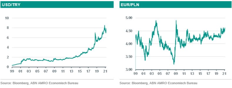 Op dit moment zit er weinig richting in de koers van de złoty. Sinds juni 2020 zit EUR/PLN in een bandbreedte van 4,35-4,65. Als beleggers somberder worden over de eurozone (belangrijkste afzetmarkt) dan daalt de złoty vaak, terwijl de munt in waarde stijgt als het omgekeerde het geval. De Poolse centrale bank blijft met haar beleid de economie steunen. Af en toe intervenieert ze ook op de valutamarkten als de złoty in de ogen van de centrale bank hard is gestegen. Want een hogere munt kan negatief doorwerken op de economie. We verwachten dat de Poolse economie het beter gaat doen dan de economie van de eurozone. We denken ook dat op een gegeven moment de Poolse centrale bank eerder de rente zal verhogen dan de ECB, maar dit kan jaren op zich laten wachten. Al met al verwachten we een gematigde stijging van de złoty ten opzichte van de euro.