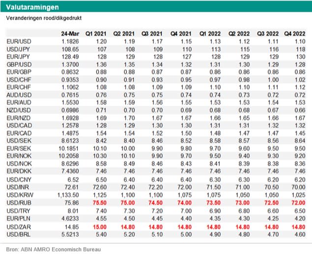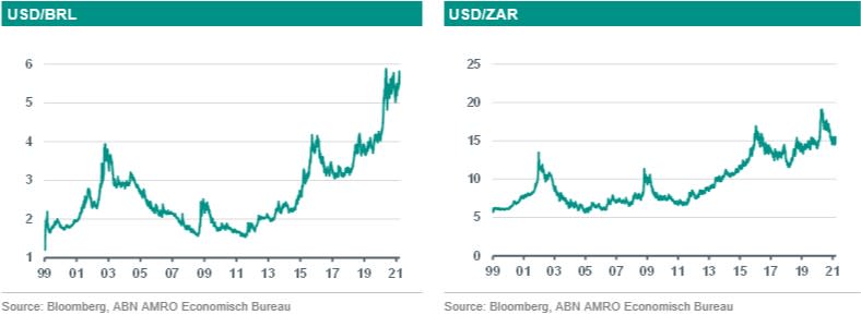 Wij denken dat de valuta’s van de opkomende markten het goed zullen doen in de rest van 2021. Hiervoor zijn een aantal argumenten aan te voeren. Ten eerste hebben de belangrijkste centrale banken aangegeven dat de rente op staatsobligaties te hard is gestegen. Vooral de ECB heeft dit gedaan. De Fed heeft aangegeven dat de beleidsrente mogelijk niet voor 2024 wordt verhoogd. Hierdoor verwachten we dat de rentes op de staatsobligaties van de VS en van de eurozone weer gaan dalen. Dit steunt de valuta’s van de opkomende markten. Vooral ook omdat wij verwachten dat een groot aantal van de centrale banken in opkomende landen de beleidsrente eerder zal verhogen dan de Fed en de ECB. De centrale banken in Brazilië, Turkije en Rusland zijn hier al toe overgegaan. Ten tweede doen deze munten het goed als beleggers optimistisch zijn en als de internationale handel en de mondiale bbp-groei aantrekken. Dit alles verwachten we zo ongeveer wel voor 2021. In zo’n marktklimaat, waarin beleggers bereid zijn meer risico’s te nemen, doen de meer risicovollere valuta’s het over het algemeen relatief goed. Ten derde verwachten we aanzienlijke inhaalgroei in de opkomende landen in 2021, zeker nu vaccins uitgerold worden. Een sterke groei in China en de VS geeft een extra stimulans aan de economische groei van de opkomende markten. Daarnaast verwachten wij dat de begrotingssaldi verbeteren. Dit alles is positief voor deze munten. Maar lagere olieprijzen en grondstofprijzen doen deze munten wat pijn. Onze energie-econoom zag een lagere olieprijs in het verschiet, maar die correctie heeft grotendeels al plaatsgevonden. Hij verwacht nu dat de Brent-olieprijs eind dit jaar op 60 dollar/vat staat en de WTI-olieprijs op 57 dollar/vat. Hieronder geven we meer aandacht aan de ontwikkelingen van de belangrijkste munten afzonderlijk.