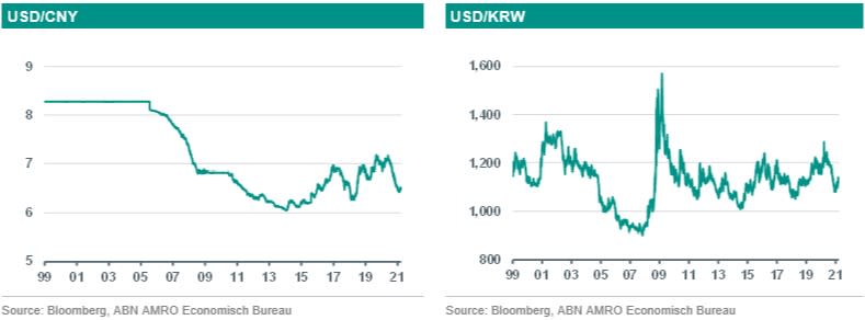 Begin 2021 daalde USD/CNY richting het niveau van 6,4. We denken dat de yuan het relatief goed blijft doen. Het monetair beleid van de Fed blijft waarschijnlijk voorlopig ruimer dan dat van de Chinese centrale bank. Daarvan kan de yuan profiteren. Daarnaast gaat de yuan geleidelijk aan een steeds belangrijkere rol spelen op de financiële markten. Dit vertaalt zich in een toenemend aandeel van de yuan in de valutareserves van centrale banken. Ook zal de Chinese yuan op de valutamarkten meer verhandeld worden (de omzet neemt toe). Dit is overigens niet een proces van jaren, maar van decennia. Het is belangrijk dat de Chinese financiële markten nog meer liquiditeit krijgen en zich verder ontwikkelen. Deze factoren steunen de yuan op de lange termijn.