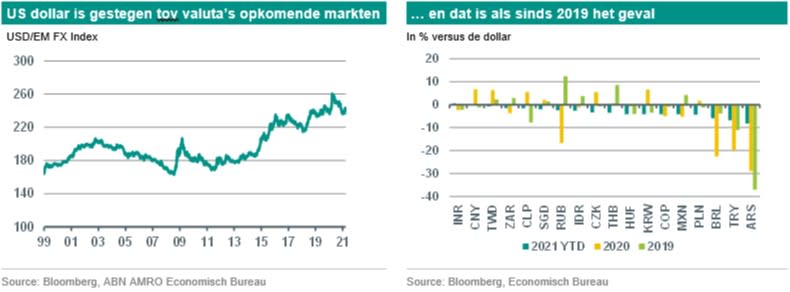 Dit jaar heeft de Amerikaanse dollar het tot dusverre beter gedaan dan een mandje van valuta’s van opkomende markten. Maar de verschillen tussen de diverse EM-valuta’s zijn groot. De Braziliaanse reaal en de Turkse lira zijn nu uit de gratie, terwijl de Indiase roepie het sinds eind 2020 zelfs iets beter heeft gedaan dan de dollar.