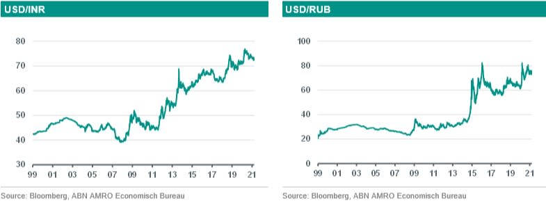 De Indiase roepie is niet zo gevoelig voor de vooruitzichten voor de mondiale economische groei en handel. Deze munt reageert meer op de ontwikkelingen in India en het algemeen beleggerssentiment. We denken dat de Indiase economie een sterk herstel laat zien, sterker dan in andere Aziatische landen. Dit is positief voor de roepie als beleggers positief blijven. Maar de centrale bank van India verruimt mogelijk haar monetair beleid nog dit jaar. Hierdoor heeft de roepie weinig ruimte om te stijgen. Daarnaast houden beleggers de Covid-ontwikkelingen in India nauwgezet in de gaten. Dus we zien een gematigde stijging van de roepie ten opzichte van de dollar dit jaar.