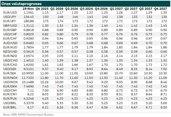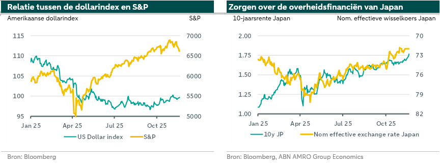 Op 4 oktober 2025 won Sanae Takaichi de strijd om het leiderschap van de LDP en op 21 oktober werd ze beëdigd als premier van Japan. Ze heeft zich zeer uitgesproken getoond over het opvoeren van de fiscale stimuleringsmaatregelen voor de Japanse economie. Als gevolg daarvan is de rente op Japanse staatsobligaties met een looptijd van tien jaar met meer dan 10 basispunten gestegen en is de yen met bijna 6% verzwakt ten opzichte van de Amerikaanse dollar en met 4% ten opzichte van de euro (zie grafiek rechtsboven). De financiële markten maken zich zorgen over de overheidsfinanciën van Japan en de omvang van het stimuleringspakket. De overheidsschuld is ongeveer 220% van het bbp en het begrotingstekort is 2,0% van het bbp (2024). Het begrotingstekort wordt voornamelijk binnenlands gefinancierd, in tegenstelling tot de VS, waar buitenlanders een aanzienlijk deel van het tekort financieren. Daarnaast zijn de spanningen met China opgelopen. Dit werkt ook negatief door op de yen. Als gevolg van deze ontwikkelingen is de sterke relatie tussen de renteverschillen en de USD/JPY of EUR/JPY verbroken. Maar we verwachten dat de renteverschillen in 2026 weer een belangrijke rol zullen spelen om de yen te ondersteunen, vooral als de bezorgdheid over de overheidsfinanciën van Japan enigszins afneemt. Bovendien verwachten we dat de Bank of Japan het monetaire beleid geleidelijk zal blijven verkrappen.