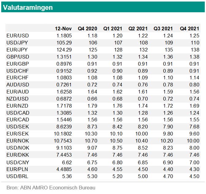 Maandag kwam er positief nieuws uit over het vaccin dat door Pfizer en BioNTech is ontwikkeld tegen COVID-19. De eerste tussentijdse analyse laat zien dat het meer dan 90% effectief is in het voorkomen van de ziekte. Financiële markten reageerden sterk op dit nieuws. Rentes op staatsobligaties stegen, cyclische valuta’s stegen en de goudprijs daalde. Aanvankelijk deed de koers van EUR/USD weinig. Dit kwam doordat de rentes op Amerikaanse en Duitse staatsobligaties allebei stegen. Daarna steeg de dollar toch, omdat het renteverschil alsnog meer in het voordeel van de dollar bewoog. De Amerikaanse obligatierente bleef op het hogere niveau, terwijl de Duitse obligatierente weer iets daalde. In het verleden hadden renteverschillen op staatsobligaties een belangrijke invloed op de koersvorming van EUR/USD. Dit jaar zijn er echter andere factoren die meer invloed hebben op de koers, zoals de pandemie en de actie van centrale banken (beleidsrente en opkoopprogramma). Gaan renteverschillen op staatobligaties weer een belangrijke rol spelen op de koers van EUR/USD in de nabije toekomst? We denken dat dit nog niet het geval is. De Fed zal proberen te voorkomen dat de rente op Amerikaanse staatsobligaties snel stijgt zolang de economie zwak is. De ECB verruimt mogelijk haar beleid verder in december. Met het oog daarop verwachten we lagere Duitse obligatierentes. We houden er rekening mee dat in 2021 een vaccin naar iedereen wordt uitgerold. De economie zal dan herstellen. Maar de Fed en ook de ECB zullen nog lange tijd een verruimend beleid voeren. Daardoor is er geen ruimte voor hogere obligatierentes. Voor de dollar speelt de rente gecorrigeerd voor inflatie een belangrijke rol. Deze is negatief, wat mogelijk in een zwakke dollar in 2021 resulteert.