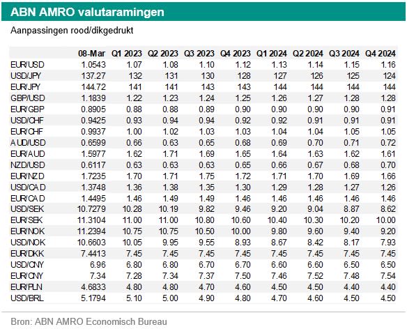 Daarom verwachten wij dat de SNB haar beleidsrente op 23 maart opnieuw met 50 basispunten zal verhogen. Dit ondanks een vertraging in de economie en een Zwitserse PMI die onder de 50 ligt. De SNB heeft alleen een inflatiemandaat. De SNB stelt prijsstabiliteit gelijk aan een stijging van de Zwitserse consumentenprijsindex (CPI) van minder dan 2% per jaar. Wat is het effect op de Zwitserse frank? Een hogere beleidsrente zou de frank moeten ondersteunen. Als andere centrale banken - zoals de Fed en de ECB - de beleidsrente de komende maanden echter sneller gaan verhogen, is het waarschijnlijk dat de frank daalt ten opzichte van de dollar en de euro. Onze prognose voor het einde van het jaar in EUR/CHF is 1,03.