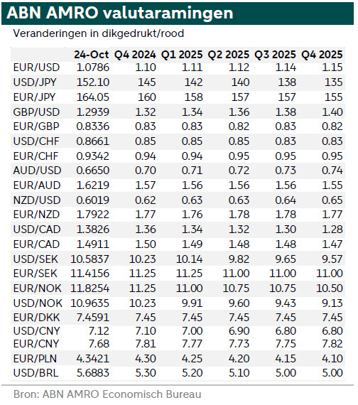 Sinds begin oktober is de Amerikaanse dollar met bijna 4% gestegen. EUR/USD is zelfs gedaald tot onder 1,08. De nominale en reële renteverschillen tussen de VS en Duitsland zijn verschoven in het voordeel van de Amerikaanse dollar. Dit weerspiegelt het feit dat de markten dit jaar minder renteverlagingen voor de Fed hebben ingeprijsd na sterke Amerikaanse cijfers, maar juist meer renteverlagingen voor de ECB. Hoewel de renteverschillen zijn opgeschoven ten gunste van de dollar, is de beweging aanzienlijk groter in EUR/USD dan de renteverschillen zouden doen vermoeden. Nu de Amerikaanse verkiezingen naderen, hebben de ontwikkelingen in de peilingen meer impact op de US-dollar. De verwachting dat voormalig president Trump de komende verkiezingen gaat winnen, heeft de dollar gesteund (zie hier voor meer informatie).