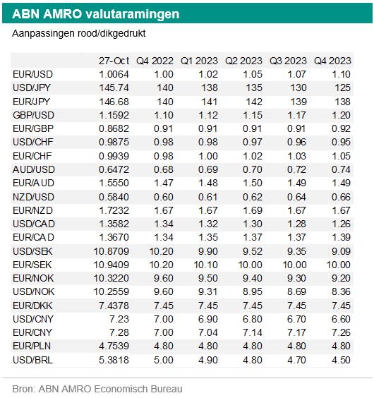 Sinds de publicatie van onze FX Weekly vorige week zijn de eerste en de laatste factor uitgekomen. De markt heeft haar verwachtingen voor agressieve renteverhogingen door de Fed licht neerwaarts bijgesteld. Dit heeft enigszins negatief doorgewerkt op de Amerikaanse dollar. Bovendien intervenieerden de Japanse autoriteiten afgelopen vrijdag op de valutamarkten en waren er maandagochtend vroeg opnieuw geruchten over een interventie. De markt had de Japanse autoriteiten serieus op de proef gesteld in hoeverre zij USD/JPY hoger en voorbij het psychologische niveau van 150 konden duwen. Uiteindelijk kwam USD/JPY in de buurt van 152 (151,94 was het hoogste punt). De FX-interventie op vrijdag vond plaats op een moment van verminderde liquiditeit, waardoor de impact groter werd en op een moment dat de Amerikaanse dollar moeite had om veel hoger te komen. Vanuit dit oogpunt kon de timing dus niet beter zijn. De yen is met meer dan 3% hersteld sinds het dieptepunt op 21 oktober.