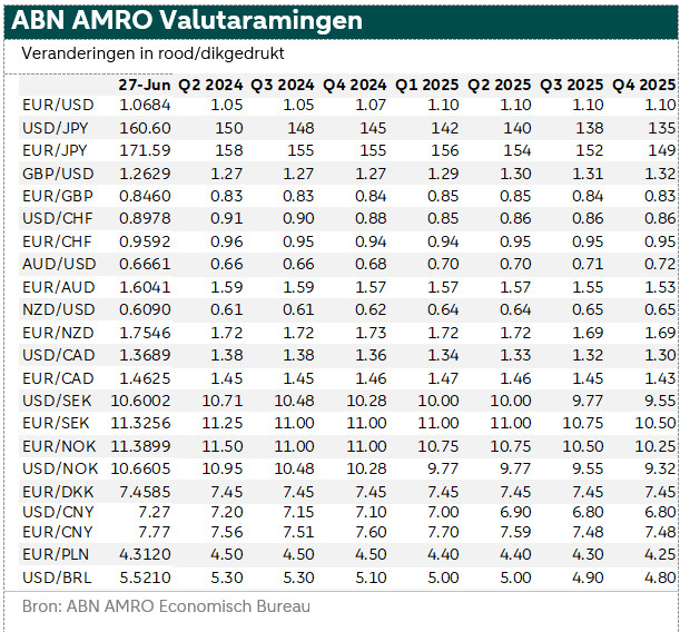 Begin volgende week (1-3 juli) wordt in Sintra Portugal het ECB Forum on Central Banking in 2024 gehouden. Gouverneurs van centrale banken zullen aanwezig zijn, waaronder ECB-president Lagarde en Fed-voorzitter Powell. De focus van de financiële markten zal volgende week dus liggen op de commentaren van ECB- en Fed-functionarissen. Hun commentaar kan de valutamarkten in beweging brengen, vooral als hun commentaar meer verruimingsgezind is. De gouverneur van de centrale bank van Brazilië is ook in Sintra. Al enige tijd probeert de regering van president Lula beslissingen over het monetaire beleid te beïnvloeden en de centrale bank verzet zich hiertegen. De onzekerheid of de centrale bank onafhankelijk monetair beleid kan blijven voeren, is een van de factoren achter de zwakte van de munt.