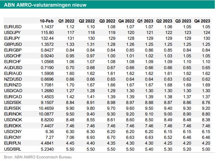 Heeft dit gevolgen voor onze ramingen in EUR/USD? Jazeker. Maar het is ook belangrijk om mee te nemen met hoeveel renteverhogingen beleggers nu rekening houden voor de ECB en de Fed. Voor 2022 gaan beleggers ervan uit dat de ECB vier keer de depositorente verhoogt in stapjes van 10 basispunten. Wij verwachten maar één rentverhoging. Ten aanzien van de Fed verwachten beleggers dit jaar vijf stappen van 25 basispunten. Wij gaan uit van vier stappen. Dus beleggers houden rekening met meer renteverhogingen dan wij. Als onze visie uitkomt dan gaan beleggers zowel voor de ECB als voor de Fed rekening houden met minder renteverhogingen. De grootste aanpassing in de verwachtingen is ten aanzien van de ECB. Hierdoor denken wij nog steeds dat EUR/USD gaat dalen maar deze daling zal waarschijnlijk minder groot zijn dan we eerder dachten. We hebben onze ramingen voor EUR/USD aangepast. Onze nieuwe raming voor EUR/USD voor eind 2022 is 1,07 (was 1,05) en voor eind 2023 1,05 (was 1,0).
